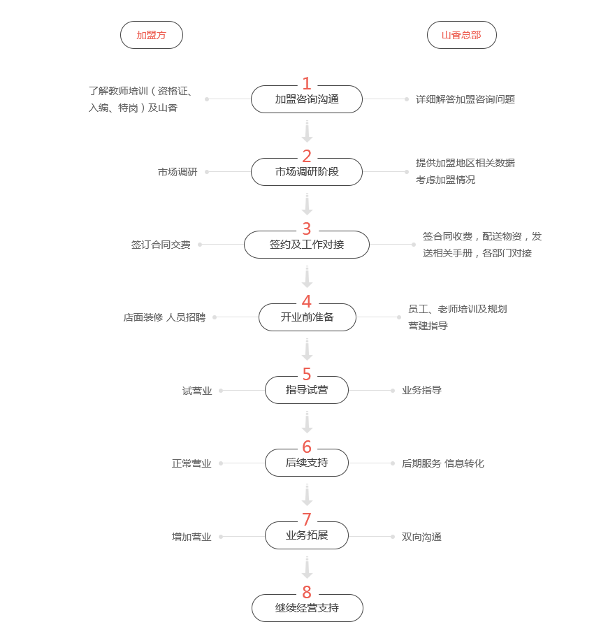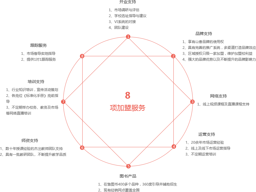 为你提供品牌、资源、运营、后勤支持、对接师资和各岗位员工培训并提供1对1跟踪服务